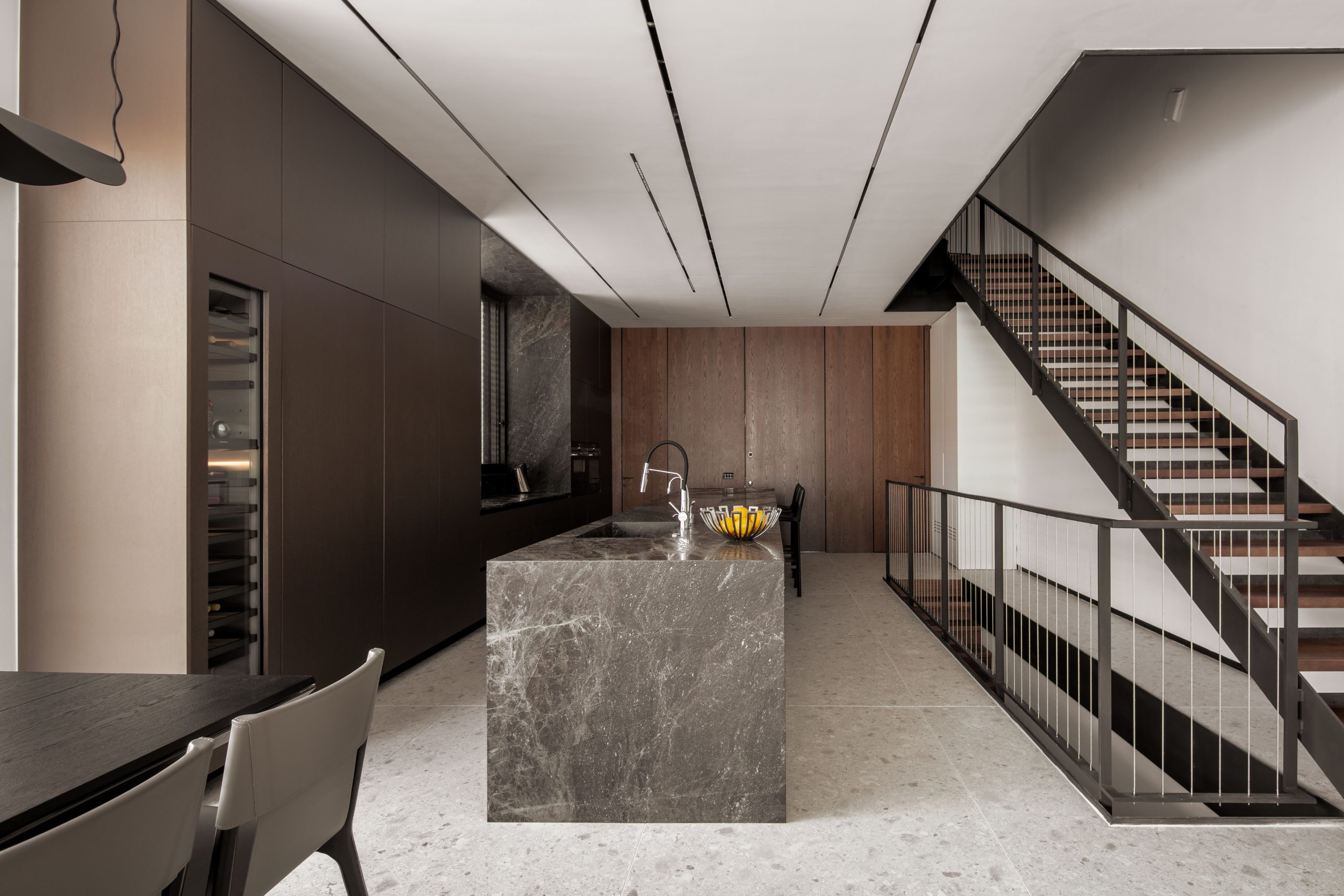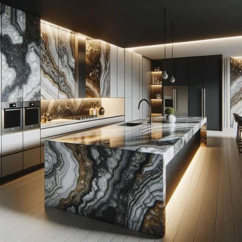 במקרים של מטבחים מודרניים עם אי, נהוג ומקובל לעצב את הארונות ההיקפיים והקווים הכלליים בגוונים חלקים ואטומים, ולתת למשטח האי, לוח אבן טבעית דומיננטי עם גידים פראיים, להיות העוגן העיצובי והאלמנט המרכזי של החלל כולו.